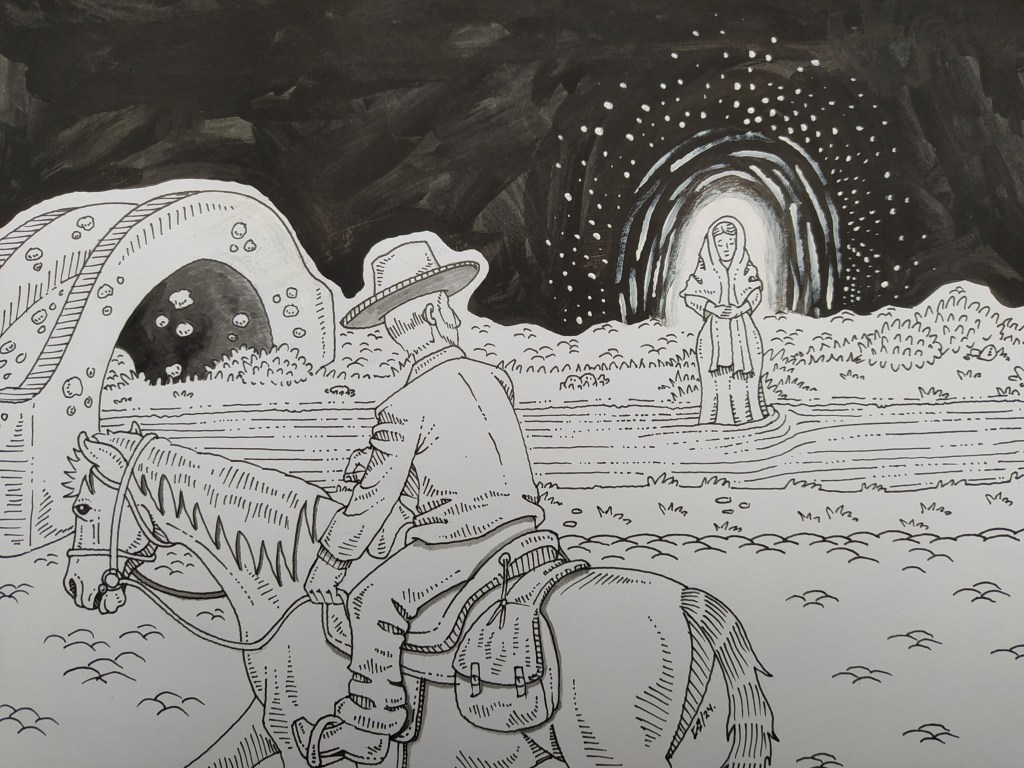 El caballo que estaba a punto de llegar al puente que cruza la vía del río Chico caminaba a un costado de este, cuando de improviso un sollozo apenas perceptible pero agudo como el rechinar de dientes abrió los cansados parpados de Vences, cuyos ojos se dirigieron magnéticamente a la hermosa figura recortada por el haz de luna y cuya sensual silueta se delineaba a la perfección a través de la bruma que exhalaba el cauce del río.
