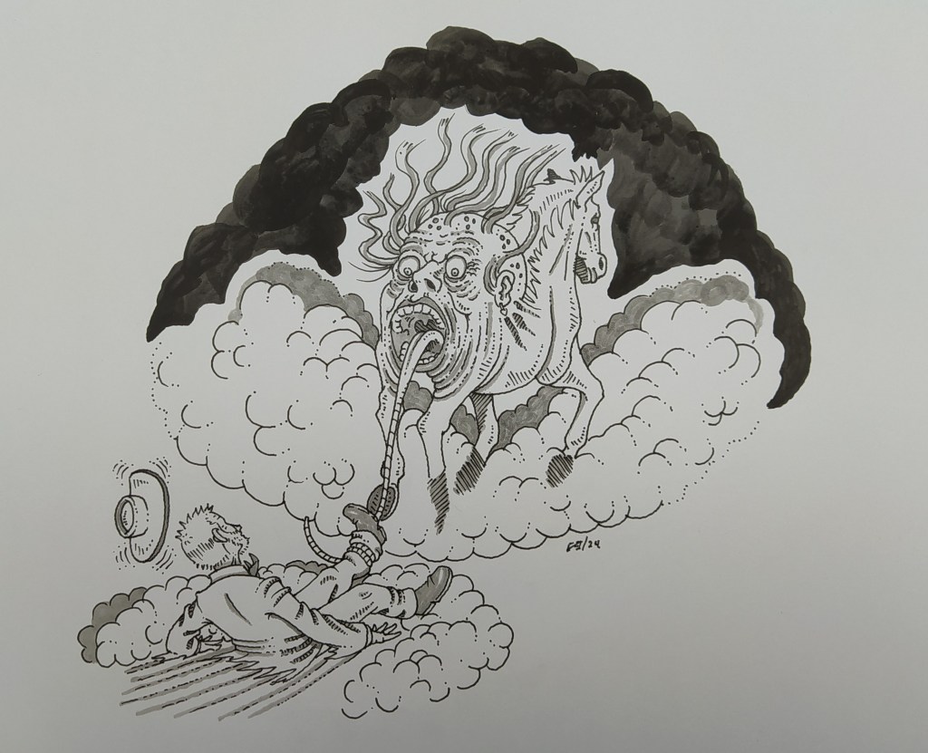 – Hace mucho tiempo en el pueblo que alguna vez fue El Potrero vivió una hermosa mujer de piel blanca como la porcelana y pelo rubio como el trigo recién segado… – Un bostezo inapropiado interrumpió a la viejita que inmediatamente suprimió con sus fuertes nudillos pétreos el inoportuno desacato- Me vuelves a interrumpir y te amarro una serpiente de cascabel al pájaro-…como decía esta ninfa de villorrio era el premio mayor de aquella localidad y todos los hombres de los alrededores y de mucho más lejos querían desposarla y convertirla en la madre de sus hijos. Pero el atractivo de los ceméntales amanalquenses es difícil de resistir y un galán surgido de nuestra cantera fue el feliz afortunado. Ambos se conocieron en el lienzo charro que celebraba el aniversario de la fundación de El potrero. Emiliano, nuestro digno representante participó en el magno evento, haciendo toda clase de cabriolas con su fiel compañero Hermes y con el lazo derribó a los becerros más testarudos de los alrededores. La multitud enloquecía al ver sus proezas en materia de charrería y las mujeres le entregaban su corazón. Pero el sólo tenia ojos para Brenda la hija del hacendado más rico de todos los municipios del estado. A los pocos meses y debido en parte a su carisma obtuvo la mano de la codiciada flor, y juntos se mudaron a una hermosa residencia en Amanalco(regalo del padre), pero no paso mucho tiempo para que la tempestad azotara a la feliz pareja. Un amargo día, Emiliano conoció las apuestas en las carreras de caballos. El vicio al juego absorbió todo su tiempo, perdía más de lo que ganaba y para colmo, en los días donde tenia una muy mala racha descargaba su furia en su bella flor, arrebatándole la belleza poco a poco a causa de los innumerables cardenales que le dejaba en todo el rostro congestionado. Una noche Brenda recostada en la cama y al estirar su brazo no encontró el cuerpo de su esposo. Y con una resolución que no era propia de su temperamento decidió encarar a su pareja sobre su vicio al juego, sabiendo que se buscaba no sólo una tunda sino posiblemente la muerte. Al salir a la fría noche encontró luz en las caballerizas y a hurtadillas se asomo al interior del establo. La nausea no describe la desilusión que experimentó Brenda, pues su marido en un estado lamentable de embriaguez besaba y acariciaba a Hermes dedicándole los más dulces halagos y mimos. Afirmando con convicción que lo amaba más a él que a su compañera de vida y acto seguido lo besó prolongadamente en su morro quitando solícitamente la bolsa de avena. Brenda en un arranque de celos enfermizos esperó en las sombras a que su marido saliera del establo a regar con agua de riñón una esquina retirada de las caballerizas. Ya a solas con el caballo lo maldijo y escupió sobre él innumerables veces, a lo que el animal apenas y se inmutó, la historia se repetía, al igual que su madre, ahora era ella la que tenia que lidiar con un marido golpeador y adúltero y por si fuera poco remplazada por una bestia domesticada. Inopinadamente una idea atroz cruzó su dorada cabeza. Tomaría una unidad de dinamita y la colocaría en la bolsa del alimento del corcel. Y siguiendo su plan al pie de la letra, encendió el explosivo en una lámpara de petróleo colgada de un poste cercano al animal, la deslizó al interior de la bolsa del alimento de su competencia. Salió corriendo de la caballeriza y Emiliano para su sorpresa al topársela le espetó.